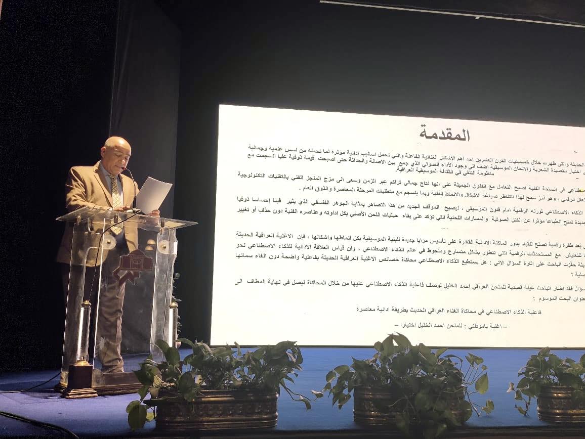 Dr. Adnan Khalaf Sahi, a lecturer at the Faculty of Fine Arts, Basra University, Department of musical arts, participated in the activities of the Arab Music Conference in its thirty-third session with an artistic research entitled "the effectiveness of artificial intelligence in simulating modern Iraqi singing in a contemporary instrumental way. A song, my homeland: by composer Ahmed Khalil.