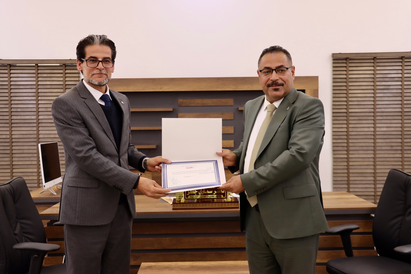 The dean of the Faculty of Fine Arts at the University of Basra, professor Dr. Nasser Samari Jafar, honors assistant professor Dr. Hassan Hadi Abdul Kazim, in appreciation of his valuable scientific efforts and his active participation in the process of the college.